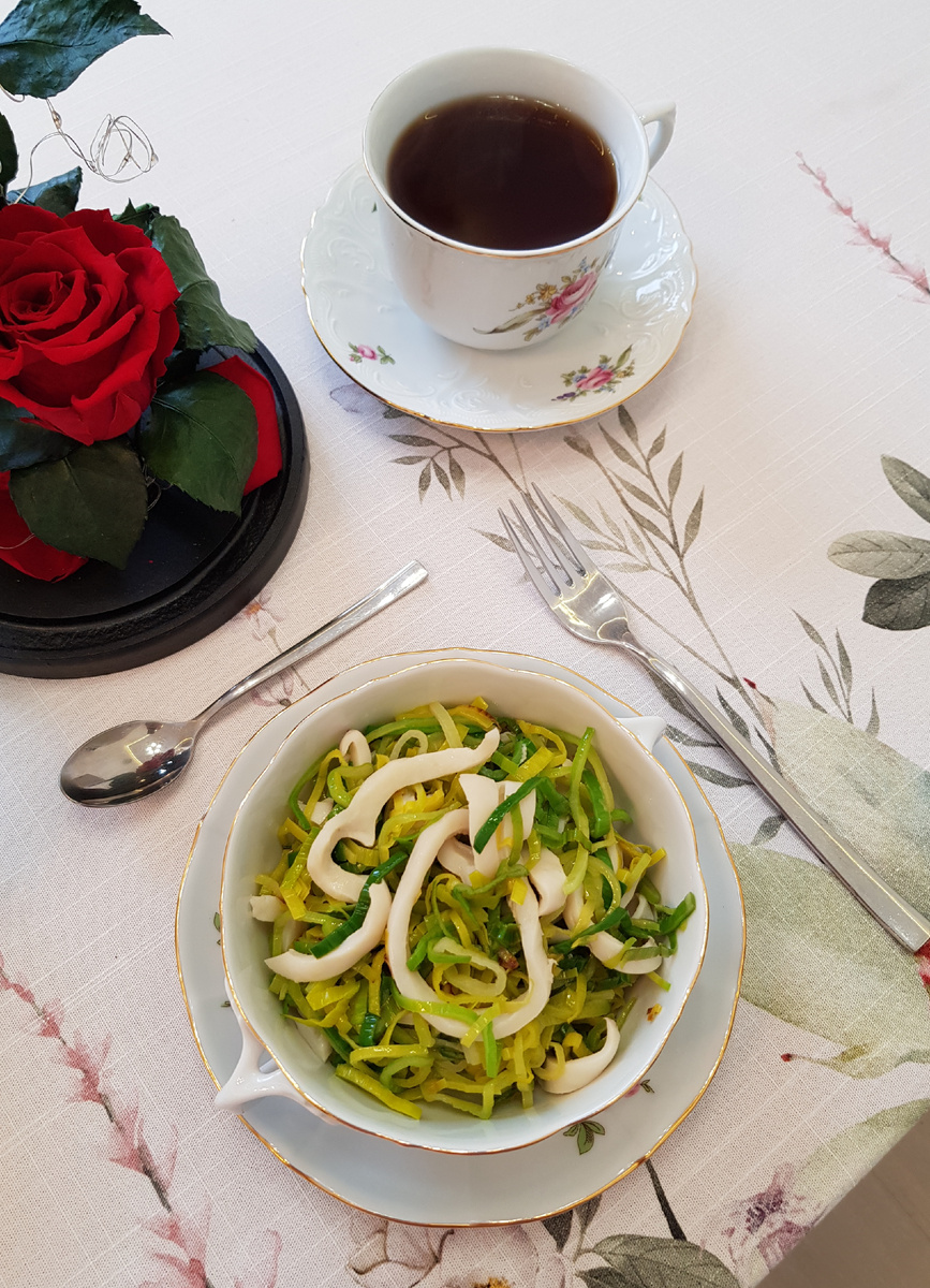 Добрый день, дорогие друзья! Сегодня я представляю вашему вниманию легкое и насыщенное белком блюдо из кальмаров и лука-порея. Для приготовления 4 порций нам понадобятся: 400 грамм очищенных колец кальмара, 400 грамм лука-порея, 15 грамм масла из виноградных косточек, 15 грамм топленого сливочного масла, 5 грамм соли, 10 грамм лимонного сока. Приготовление: лук-порей нарезать полукольцами. Разогреть сковороду с растительным и выложить на сковороду лук-порей. Добавить топленое масло и пассеровать 5 минут. В кипящую воду опустить на 1 минуту размороженные кальмары. Через одну минуту кальмары вынуть и посолить. Добавить кальмары к луку. Перемешать, полить лимонным соком и тушить в течение 1 минуты. Разложить блюдо по тарелкам. Приятного аппетита!