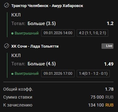 🔢🔢🔢🔢 Вчера мы вынесли линию 3➕➕➕ из 3. Без шансов для контор, без выдумок, без случайностей. Сегодня продолжаем давить. Приготовил 5 прогнозов — боевых, отточенных, таких, что букмекеры будут снова хрипеть. Если ты вчера смотрел со стороны — сегодня твой шанс залететь в реальную работу. Если ты вчера был со мной — ты знаешь, что ждать: только плюсы, только давление, только стабильный результат. 🔥 Сегодняшний игровой день обещает быть прибыльным. 📊 Анализ чёткий, уверенность максимальная. 📦 Внутри: 🔹 Надежные события 🔹 План по банку 🔹 Лучшие коэффициенты 📈 Вчера был ➕➕➕ — сегодня повторим. 1️⃣ #1 Хоккей 14:30 - коэффициент 1.70+ 2️⃣ #2 Футбол 16:00 - коэффициент 1.90+ 3️⃣ #3 Футбол 18:45 - коэффициент 2+ 4️⃣ #4 Хоккей 00:00 - коэффициент под 1.80 5️⃣ #5 Хоккей 03:00 - коэффициент 1.80+ 💸 1 прогноз — 2500₽ 💸 2 прогноза — 4600₽ 💸 3 прогноза — 6600₽ 💸 4 прогноза — 8500₽ 💸 5 прогнозов — 10 000₽ 👉 @BetsFootballbot — оплата и выдача сразу внутри. 🥇 Сегодня твой шан