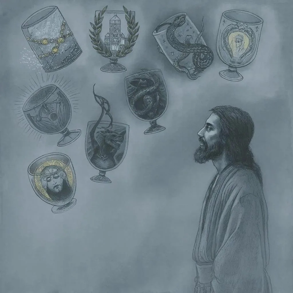 В каждой — соблазнительные образы: драгоценности, лавровый венец, замок, змея, голова в сиянии, тёмная фигура, дракон...