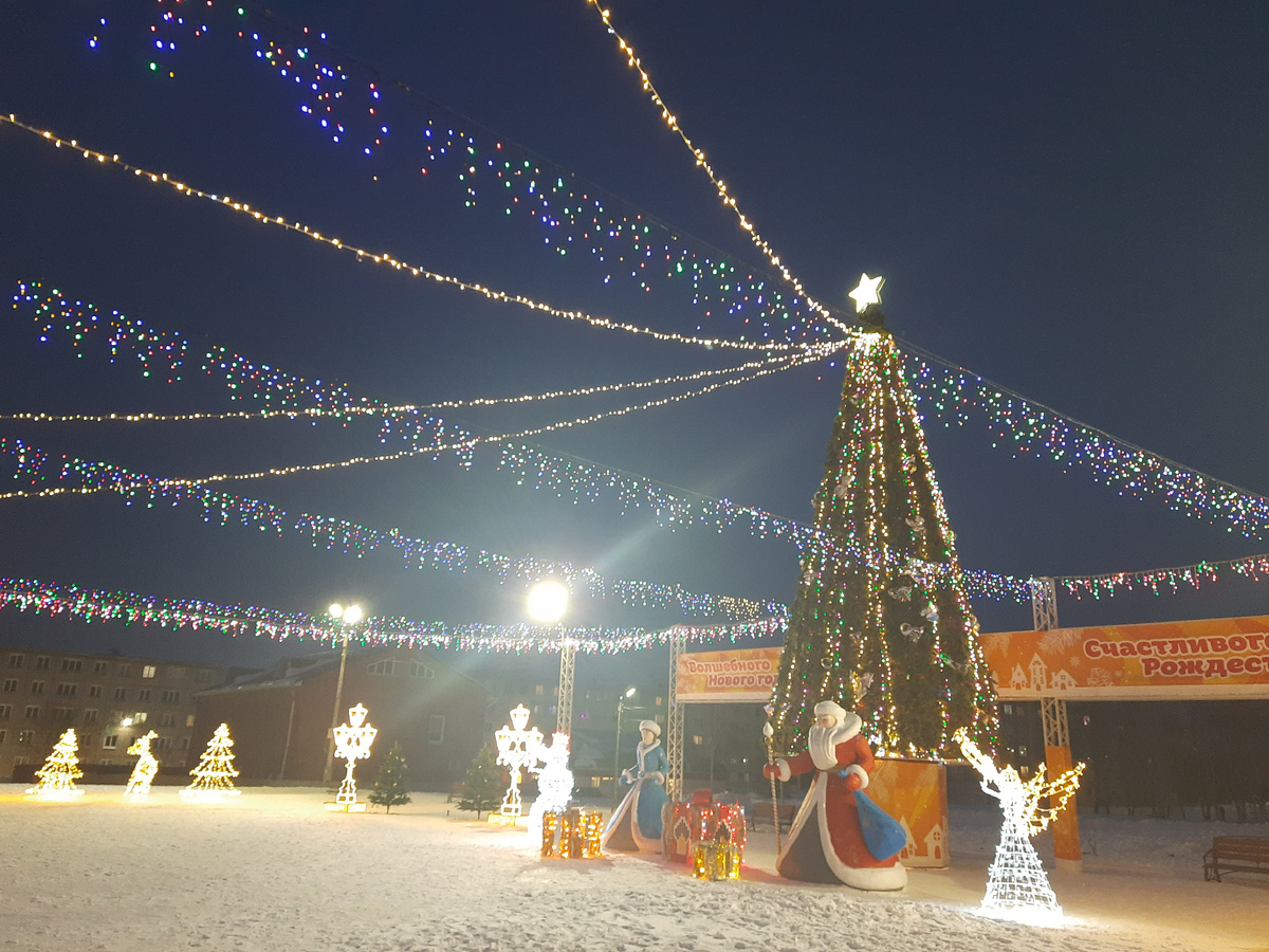 Сияющие фигуры снеговичка, ангелочка, оленей, ёлочек.