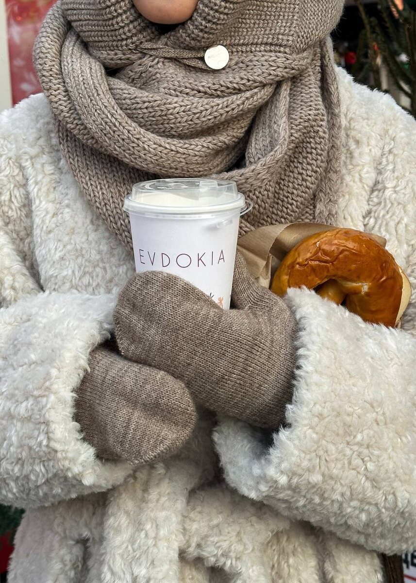 🥨🌟 Наступили финальные выходные перед рабочими буднями, поэтому не упускаем ни дня, чтобы насладиться праздничной Москвой! Собрали тёплый образ для долгой прогулки: двухсторонняя дубленка, вязаный капор и варежки ❄️
