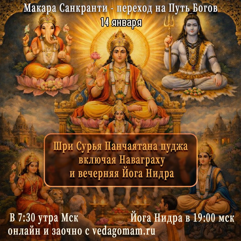 : 7:30 мск - онлайн Шри Сурья Панчаятана пуджа, в честь Макара Санкранти окончательный переход Сурьи на Северный Путь (Путь Богов - день Богов). Знаменует собой время завершения перехода от времени Дакшинаяны (Пути Предков) к Уттараяне - Пути Богов. Все это время перехода мы поддерживаем через заочные пуджи поддерживая своим вниманием переходное время, когда так легко потерять ориентиры, сбиться с Пути, отвлечься на предложения ума. Эта пуджа будет про: Дух и высшее знание — связь с небесным миром, высшими силами, учителями и проводниками. Мудрость и осознание — понимание законов жизни, принятие опыта, видение целостной картины мира. Очищение и обновление — освобождение от старого, иллюзий, страхов и привязанностей. Предков и память рода — благодарность Предкам за поддержку во время Дакшинаяны. Сурья - тоже относится к одному из предков, как и Ямарадж, сын Сурьи. Покой и тишину - внутреннюю тишину, из которой рождается истинное знание Подробнее о практиках на сайте Элена Шанти Д