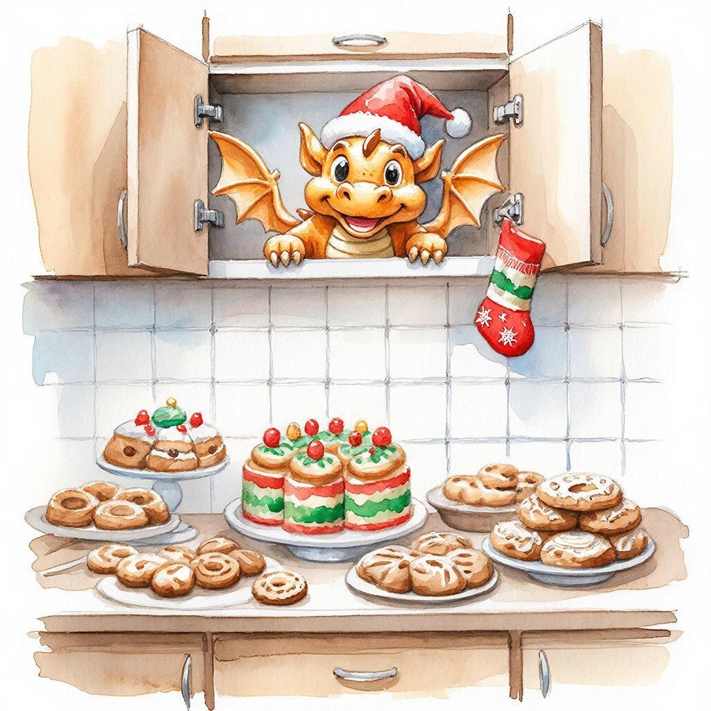 Привет, это опять я. Тот самый, что живёт за кухонным шкафом, где пахнет ванилью и забытыми конфетами. Я — Сахарный Дракон. Не огнедышащий, нет. Моя стихия — это мерцающая карамель, пушистый безе и та самая хрустящая корочка на идеальном песочном печенье. И вот настал мой звёздный час. Человеки называют его «Новогодняя готовка». Для меня это священный ритуал, полный опасностей и магии. Сидя на своей полке между банкой с гречкой и загадочным пакетом «семена чиа 2018 года», я наблюдаю. На столе — стратегический запас: масло, мука, килограммы сахара. Моё сердце (которое, кстати, выглядит как леденец-сердечко) трепещет. Начинается. Первым делом хозяйка берётся за тесто. Я чувствую, как молекулы сахара зовут меня. Я осторожно выползаю, невидимый, и начинаю свою работу. Моё дыхание — не пламя, а тёплый, сладкий ветерок. Я шепчусь с маслом, чтобы оно стало идеально пластичным. Обнимаю муку, чтобы та не сбивалась в комки. А уж над сахарной пудрой я просто колдую — она взбивается в невес