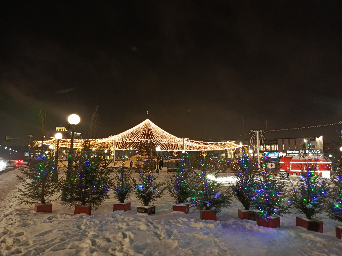 Основную ёлку Липецка традиционно устанавливают в историческом центре- на площади Петра Великого, рядом с Нижним парком. Прогуляться вышли засветло- чтобы пройти по аллеям Нижнего парка, а уже потом посмотреть новогоднюю иллюминацию. Это- историческое сердце Липецка, хранящее немало тайн, но статья всё-таки новогодняя, поэтому углубляться в историю не буду, расскажу кратко. Когда-то на месте площади было болото, которое при разливе реки Воронеж превращалось в настоящее озеро! В советское время здесь провели осушение, были проложены трамвайные линии, а точнее- здесь располагались несколько трамвайных колец. Площадь носила имя Карла Маркса, но по сути представляла собой пустырь. Липецкий "Зеленхоз" пытался облагородить это место, регулярно высаживая цветы, но они плохо приживались- видимо, из-за сырости. Но со временем площадь всё-таки приобрела вид, в 1996 году здесь установили памятник Петру Первому- на 12-ти метровом постаменте- фигура в полный рост, высотой 5,6 метров, размашистым ша
