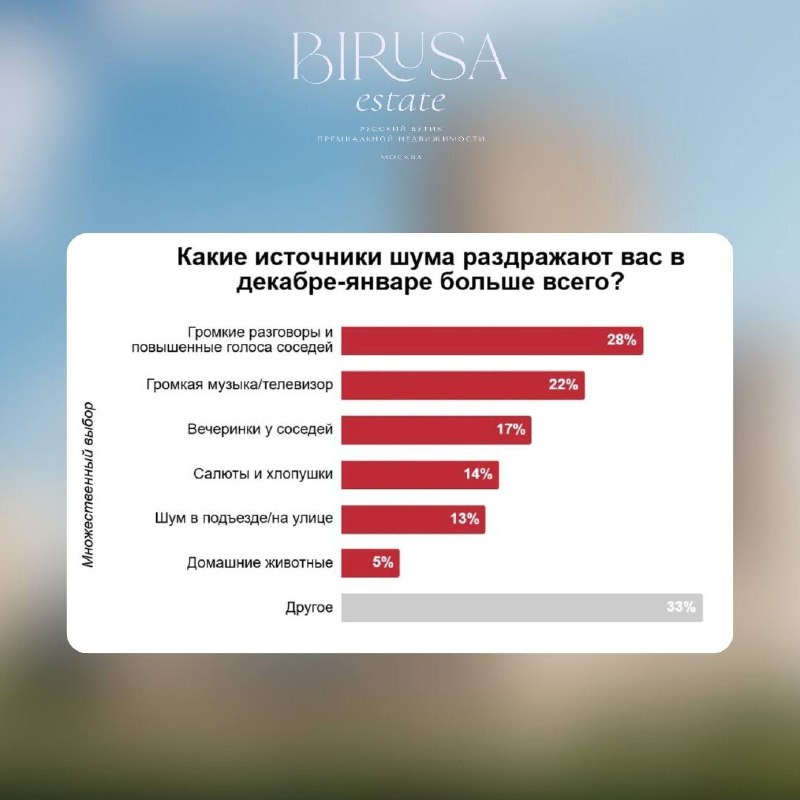 😱 Елена Инюткина, одна из админов нашего канала «Блондинки в недвижке» и совладелец АН BIRuSA estate: Не знаю кому и как, но лично меня в Новый год больше всего беспокоят салюты во дворе, так как у меня две кошки и собака, а для них это огромный стресс. И я волнуюсь за них. Но по данным опроса компании «Роквул», главные источники раздражения в новогодние праздники распределились вот так: • Громкие разговоры соседей — 28% • Музыка и телевизор у соседей — 22% • Вечеринки за стенкой — 17% • Салюты и хлопушки — 14% • Шум в подъезде или на улице — 13% • Домашние животные — 5% Как же предлагают решать проблему: — 28% людей готовы просто терпеть — по 19% опрошенных планируют попросить соседей быть тише или шуметь самостоятельно — 16% заявили о планах уехать за город — 13% будут использовать беруши и наушники — 9% включат белый шум — 8% предпочитают провести праздники вне дома А давайте сравним эту чужую статистику с вашим мнением (ниже — будет опрос)❗️ А если вдруг не найдёте вашего в