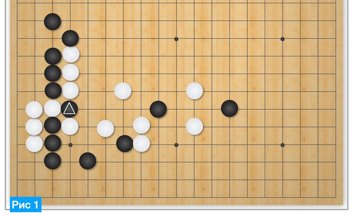Задачи сложные, а ответов к ним нет. Не во всех понятно, что считается решением: ко, сэки или два глаза. Выбрал более-менее решаемую задачу. Не уверен, что нашел верное решение, вариантов тут много. В условии лаконично сказано «черным выжить». Видимо, имеется в виду черный камень в атари. Так как остальные черные в принципе могут выжить. Если же оживить черный с треугольником, то можно затем захватить четыре белых слева. Для этого черному нужно 5 дыханий и темп. На ход черных 1 (рис. 2), блокада белых (если я верно понимаю суть задачи) не работает, так как черные убегают и съедают белого. Поэтому белые отвечают 2 на рис. 3, и далее черные не могут идти в лоб 3, так как белые отнимают у черных дыхание ходом 4, что обрекает черных на гибель. У белых больше дыханий, а у черных нет возможности выскочить. У меня сработал ход 3 (рисунок 4). Пока я не могу найти его опровержение. Но возможно, кто-то из читателей его увидит. Ход работает так как ответная попытка зажать черных приводит к са
