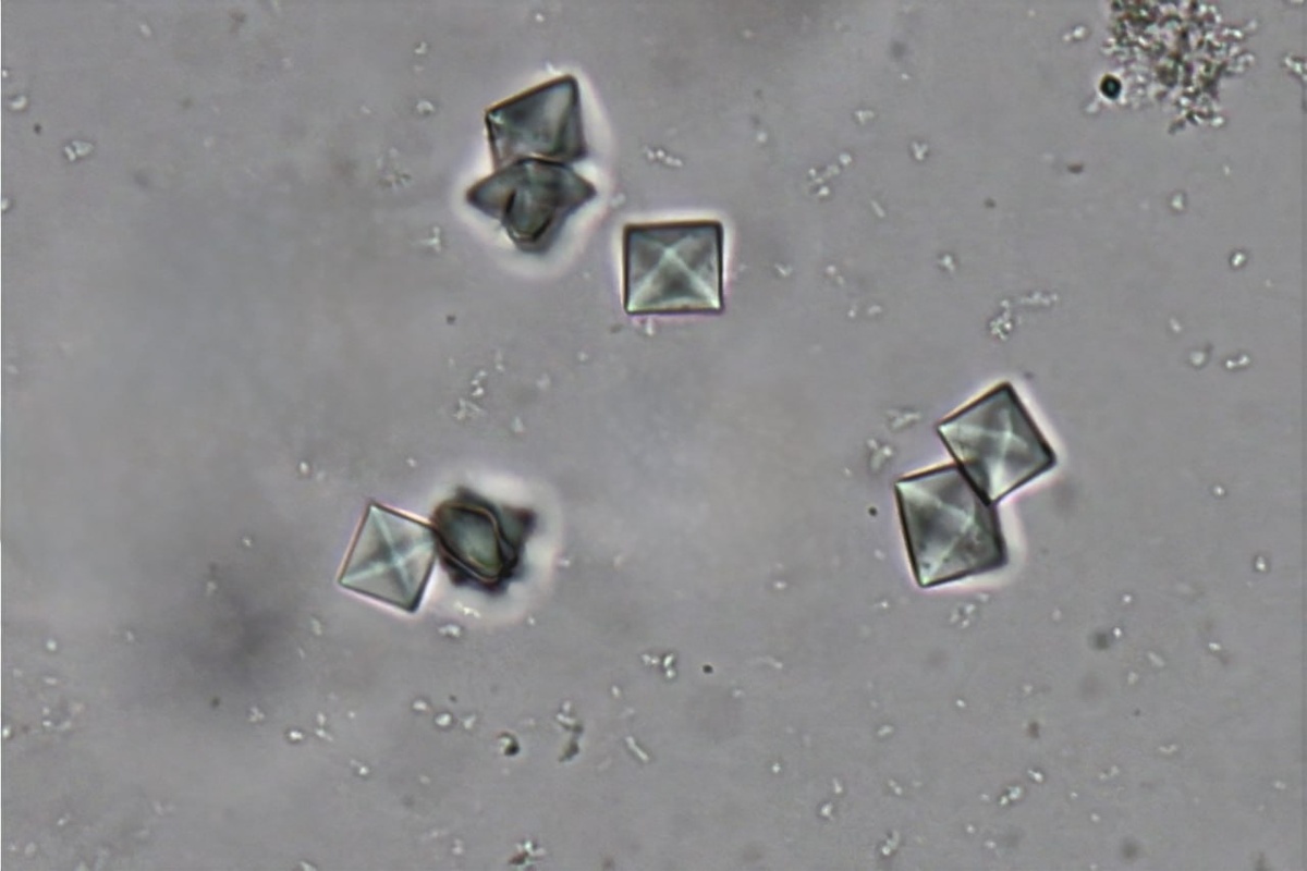 Кристаллы дигидрата оксалата кальция в образце мочи от пациента с хронической болезнью почек и гематурией.