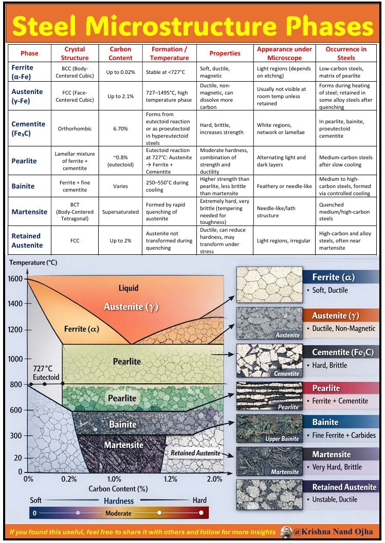 Мы часто говорим о химическом составе стали… Но на самом деле — именно микроструктура решает, выдержит ли деталь или разрушится в реальных условиях эксплуатации. Две стали с одинаковым химическим составом могут вести себя совершенно по-разному — только из-за различий в микроструктуре. Разберём каждую фазу и поймём, почему она важна в инженерной практике 👇 🟢 Феррит (α-Fe) — источник вязкости Самая мягкая и пластичная фаза в стали. Его ОЦК-решётка почти не удерживает углерод → низкая прочность, но высокая вязкость. В низкоуглеродистых сталях феррит образует сплошную матрицу, обеспечивая: • Отличную формуемость • Высокую ударную вязкость • Хорошую свариваемость ❗️Слишком много феррита → низкая прочность ❗️Слишком мало → плохая вязкость 🟠 Аустенит (γ-Fe) — двигатель превращений Существует при высоких температурах и служит отправной точкой всех термообработок. Его ГЦК-решётка хорошо растворяет углерод → именно от аустенита зависит, во что превратится сталь при охлаждении: перлит, бе