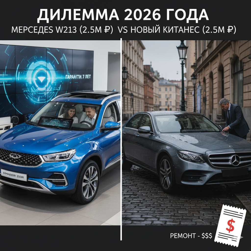 Цены на новые автомобили выросли до небес. И если раньше мы могли выбирать между новыми бюджетниками и подержанными "немцами", то сейчас дилемма стала еще сложнее. За 2.5–3 млн рублей можно взять либо новый, максимально упакованный китайский кроссовер, либо 5-летний Mercedes-Benz E-класса (W213). Давайте честно разберем, что вы получаете за эти деньги, и где рискуете потерять больше всего. Если вы хотите беззаботно ездить 3-5 лет, не думая о поломках и гарантии, а также вам важны все современные "фишки" — берите нового "китайца". Просто будьте готовы к тому, что через несколько лет придется его продавать с существенной потерей в цене. Если вы цените комфорт, статус и готовы вкладываться в обслуживание, понимая, что каждая поездка к мастеру будет стоить как ползарплаты — тогда Mercedes E-класса подарит вам совершенно иные эмоции. Но приготовьтесь к "сюрпризам". А что бы выбрали вы: комфорт и престиж с риском, или новые технологии с гарантией, но без "вау-эффекта"? Делитесь мнением в ко