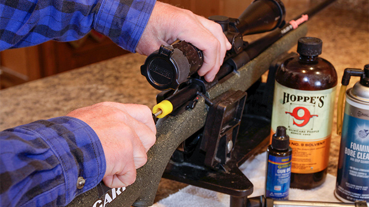 Разрядите, а затем разберите оружие согласно рекомендациям изготовителя, чтобы добраться до всех углов, пазов и щелей, где за долгие годы скопилась грязь. Чистите ствол в направлении от патронника к дульному срезу. Используйте направляющую для шомпола. С помощью сольвентов вы должны удалить всю глубоко въевшуюся в ствол медь. Чистите до тех пор, пока из ствола не начнут выходить чистые патчи.