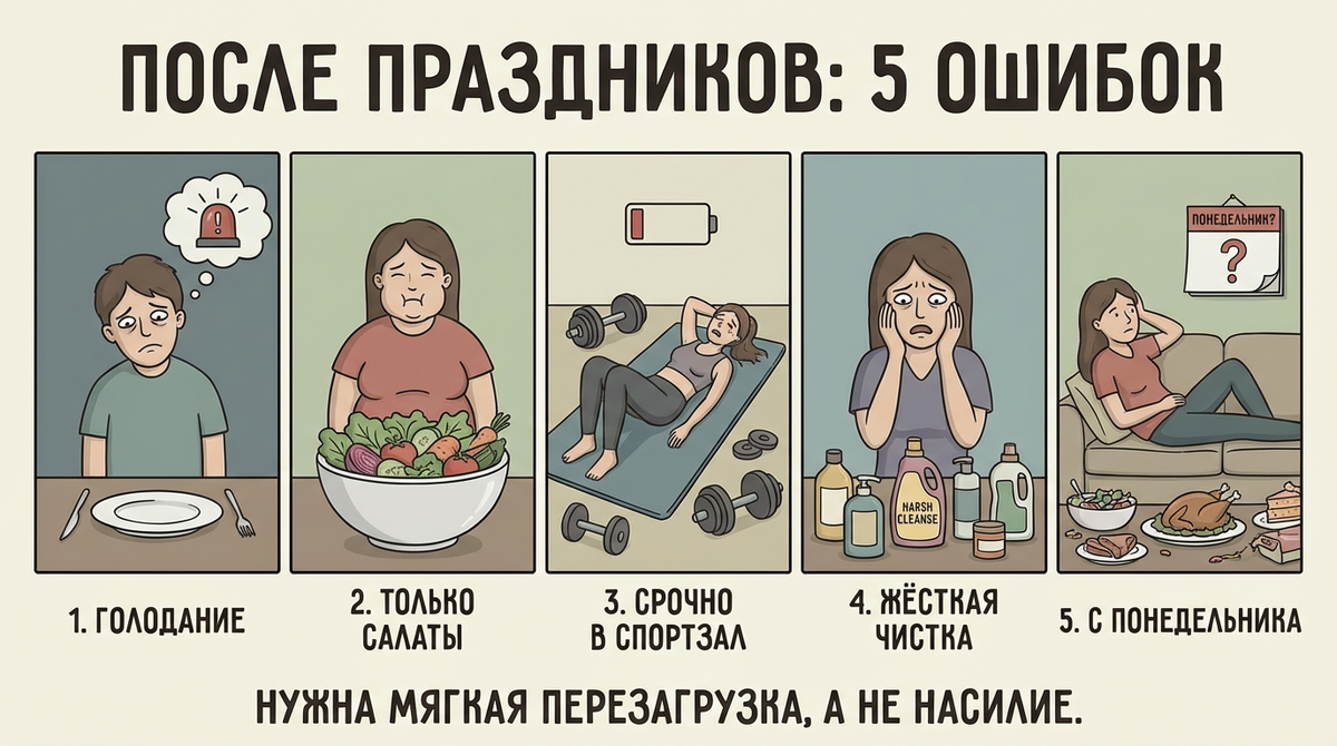 После праздников эта картина повторяется почти у каждого. Вы просыпаетесь, и тело будто не ваше: тяжесть, живот распирает, энергии ноль, настроение скачет без причины. И внутри появляется знакомая мысль: «Надо срочно что-то делать». Вот здесь и начинаются ошибки. Ниже пять шагов, которые кажутся правильными, но на самом деле только усугубляют состояние. «Сегодня вообще ничего не ем. Пусть организм отдохнёт». Кажется логичным. Но правда в том, что после праздников тело уже на пределе: переедание, поздние ужины, алкоголь, сладкое, сбитый режим. И вы резко обрываете питание без подготовки и поддержки. В ответ организм не очищается. Он пугается. Включается режим выживания. Замедляется обмен веществ, появляется слабость, раздражительность, постоянное чувство холода. Это не забота о себе. Это ещё один стресс. «Буду есть только салаты, это же полезно». После праздников пищеварение ленивое и уставшее. И когда вы загружаете его сырыми овощами, оно не благодарит. Оно протестует. Вздутие, газы, о