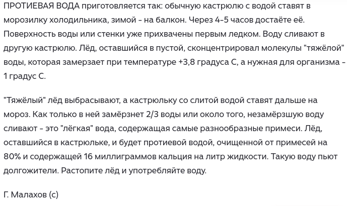 Полагаю, все слышали про тяжёлую воду. А кто-то (надеюсь, что многие) даже помнит, что это такое. А некоторые (надеюсь, что немногие) даже пытаются от неё избавиться в домашних условиях. Рецепт сего встречается в сети нередко, его автором называют Г. Малахова - известного на всю страну электрослесаря, через телевизор учившего зрителей пить мочу в целях оздоровления и дававшего другие медицинские советы: