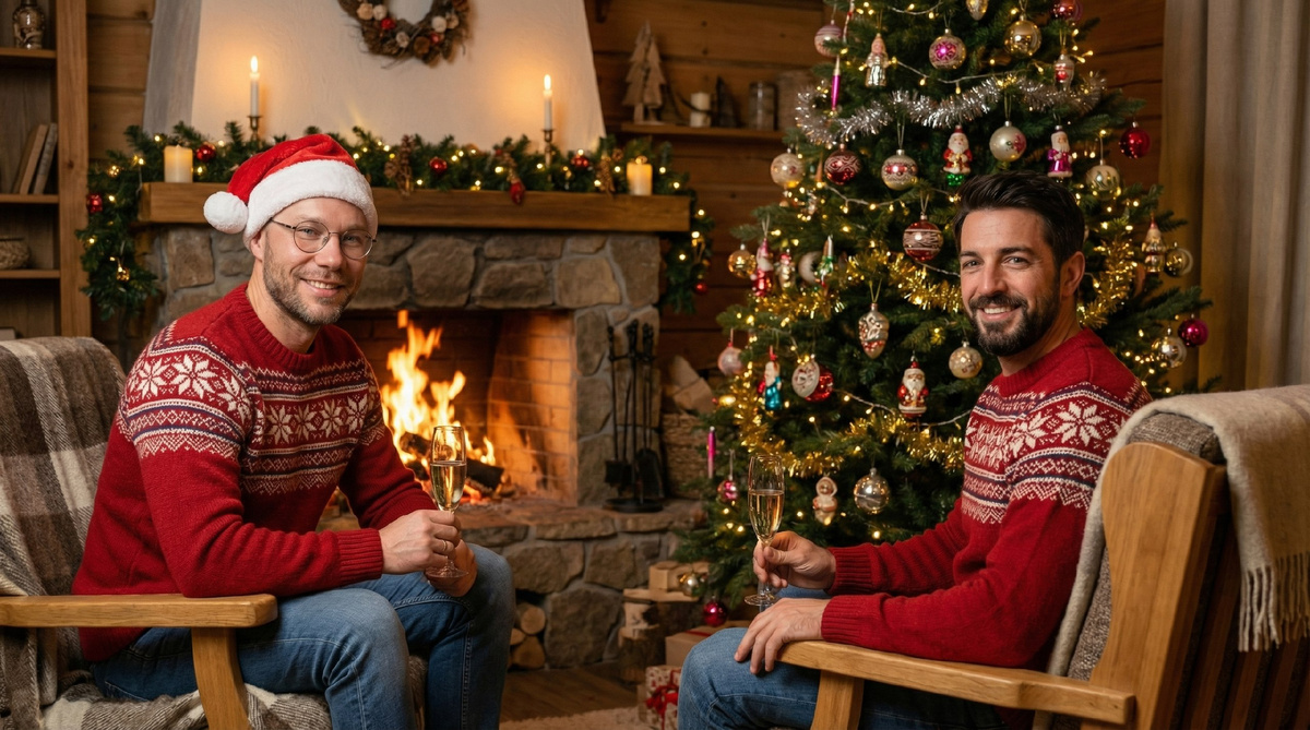 Кратко, по шагам и по делу — чтобы вы могли повторить или создать видеоролик лучше 👇 ✨ Новогодние каникулы продолжаются впереди 🎄 Старый Новый год — время разобрать, как был создан ролик с новогодним поздравлением 31 декабря от канала Республика AI 🎥🤖. За основу берём фото себя или близких 👨👩👧 Либо генерируем персонажей в Nano Banana (Gemini-3-pro-2k (nano-banana-pro) — там же можно: * объединять персонажей * менять одежду * создавать нужную атмосферу 📌 Пример промпта для генерации изображения (копируйте): [двое мужчин в норвежских национальных красных свитерах сидят по бокам, посередине, сзади камин, с фужерами с шампанским в руках, смотрят в камеру, улыбаясь, рядом стоит украшенная советскими игрушками ёлка, комната украшена новогодними гирляндами, тёплый домашний уют, натуральные материалы, чёткая высокая детализация, свет от огня играет на лицах и свитерах, съёмка 50 мм, естественное освещение] 🔁 По желанию можно изменить композицию в Midjourney, ⚠️ главное — строго заф