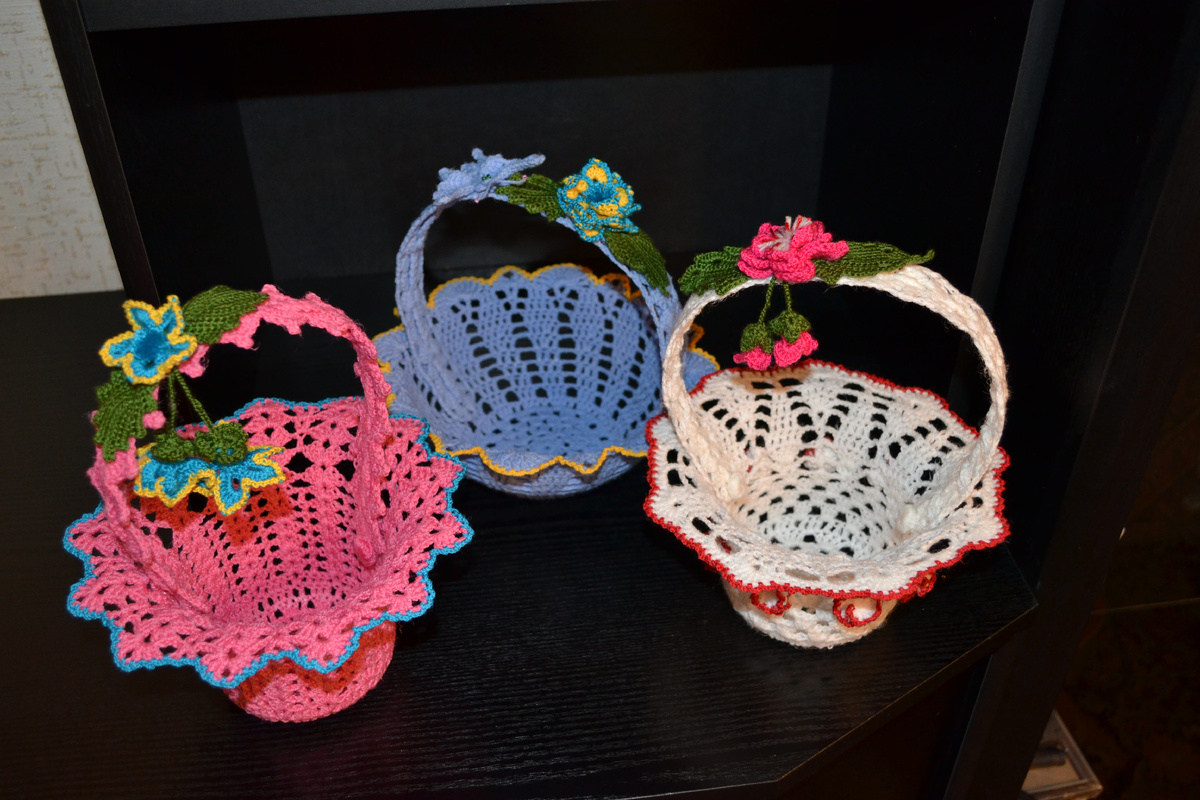 Корзиночки. Отличный будет подарок к 8 Марта. Связаны из летней пряжи, накрахмалены.