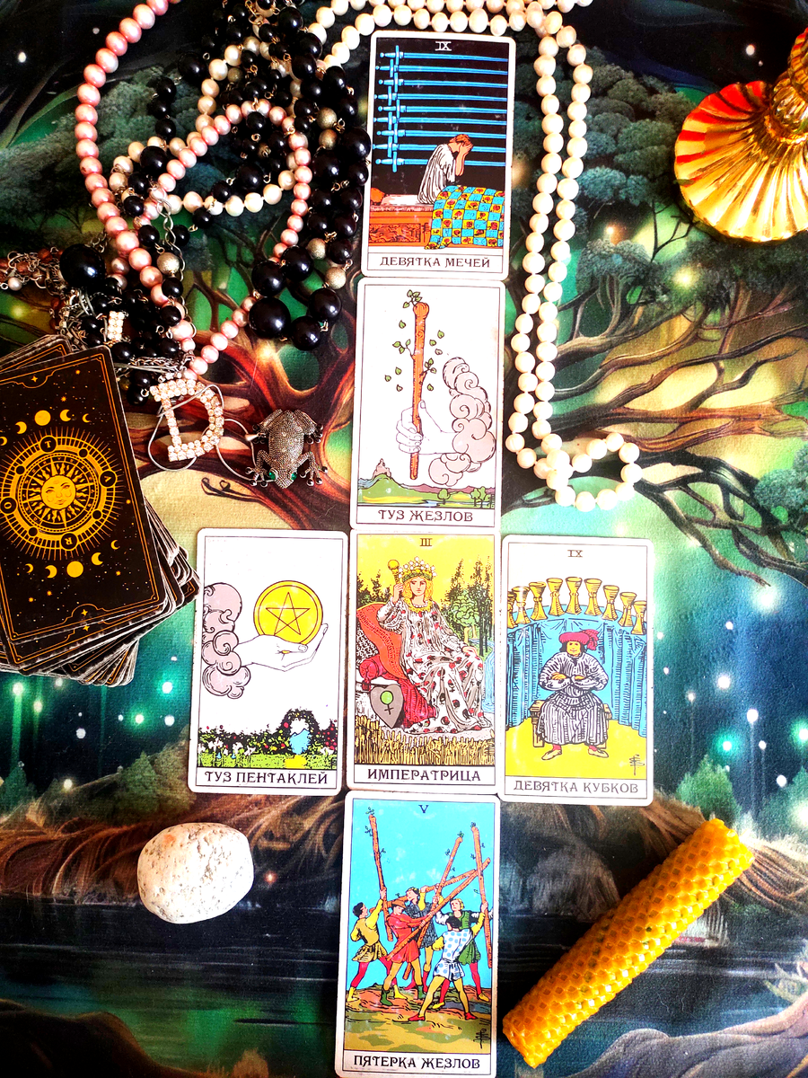 Неделя предлагает вам мощный коктейль энергий: творческий взлёт (Туз Жезлов) и практические возможности (Туз Пентаклей, Императрица) сталкиваются с внутренними демонами тревоги (9 Мечей), чтобы в итоге выйти наружу в форме страстного вызова (5 Жезлов). Профессиональное удовлетворение (9 Кубков) станет вашей эмоциональной наградой.