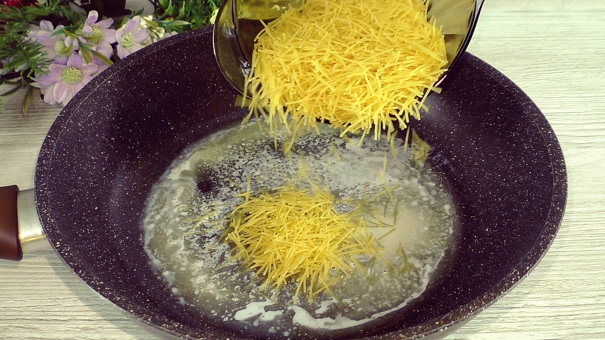 Масло растопилось, добавляем вермишель и, постоянно помешивая, обжариваем до слегка золотистого цвета.