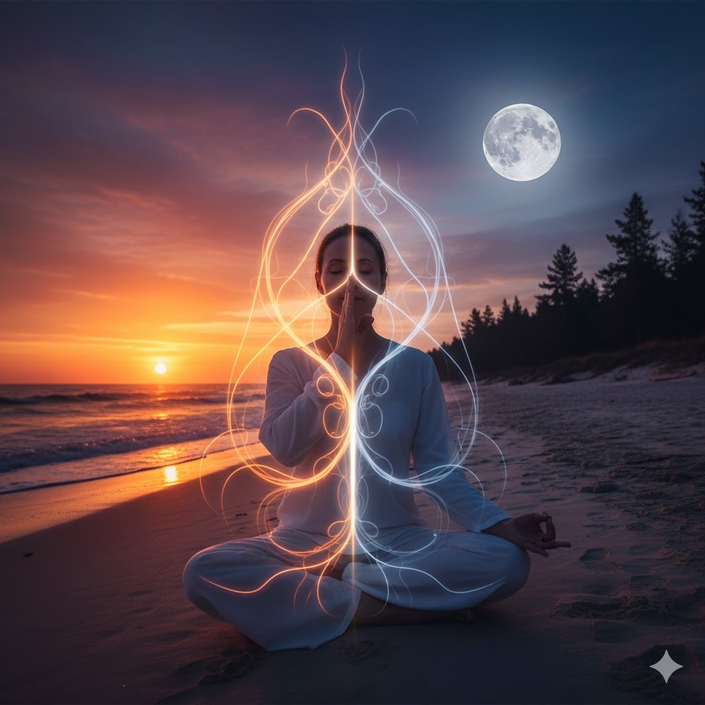 Внутри каждого из нас сияют два светила: активное солнце и безмятежная луна. И это не метафора, а древнее знание, воплощенное в самой природе нашего тела. Йоги прошлого ощущали, как по правой стороне течет согревающий солнечный поток, побуждающий нас к свершениям, а по левой — прохладный лунный свет, дарующий покой и созерцание. Наблюдая за дыханием, мудрецы открыли секрет: мы почти никогда не дышим обеими ноздрями равномерно. Каждые пару часов доминирующая роль переходит от одной к другой, переключая наши внутренние режимы. Правая ноздря открывает дверь к энергии и логике, левая — к интуиции и творчеству. Чтобы объединить эти силы, была создана Нади Шодхана — практика очищения энергетических каналов. Она балансирует лунную Иду и солнечную Пингалу, направляя поток жизни в центральное русло — Сушумну, где рождается истинное пробуждение. Термин «Шодхана» означает очищение. Нади Шодхана — это методика балансировки энергетических каналов и гармонизации психики. Урок в древнем саду: Учите