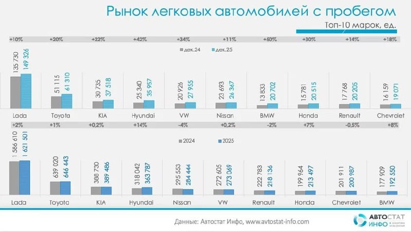 Рынок автомобилей с пробегом в отличие от рынка новых машин закончил минувший год в плюсе. Как подсчитали аналитики «Автостат-Инфо», количество сделок в этом сегменте авторынка по сравнению с 2024-м увеличилось на 3%, до 6,57 миллиона. Топ-10 марок на российской вторичке по результатам 2025 года: Lada — 1 621 501 перепроданная машина Toyota — 646 443 шт. Kia — 389 486 шт. Hyundai — 363 787 шт. Nissan — 284 444 шт. Volkswagen — 273 069 шт. Renault — 218 136 шт. Honda — 213 497 шт. Chevrolet — 200 987 шт. BMW — 192 550 шт.