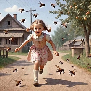 Пчелы, с мощным жужжащим гулом, рванули в продушину. Я же, бросив прут, рванула домой, но через три шага споткнулась и плашмя упала на землю. В голове пронеслось: « Все. Сожрут. Ой, мамочка!!!»