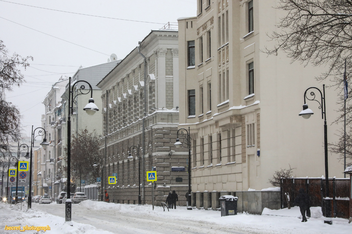 Вот эти две фигурки сказочных гномов, что стоят здесь и сегодня припорошены снежком, появились уже во второй половине двадцатого века, когда на Спиридоновке разместилось посольство Польши.