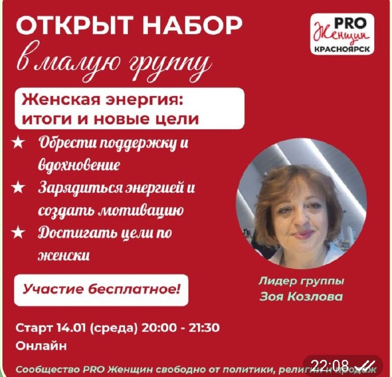 "Женская энергия: итоги и новые цели" Участие безоплатное! 🎁 Лидер сообщества PRO Женщин Зоя Козлова объявляет набор в группу поддержки для простых женщин и бизнес-вумен Потому что у каждой из нас свои цели, свои задумки! Мы все разные, но именно это и ценно. Эта группа для тех, кто хочет: ❤️ Жить в согласии с собой ❤️ Действовать из состояния гармонии ❤️ Настроиться на лучший вариант своего 2026 года На наших встречах вы сможете: ✅ Обрести поддержку и вдохновение ✅ Обсудить важные вопросы для достижения своих целей по-женски, с лёгкостью ✅ Зарядиться энергией и создать мотивацию ✅ Общаться с единомышленниками, которые ценят тепло и искренность В нашей группе: ⭐️ Комфортная атмосфера для каждой участницы ⭐️ Каждая участница поставит свою личную цель и будет двигаться к ней при поддержке группы ⭐️ Мы будем делиться своим личным опытом, тестировать гипотезы и корректировать планы, а также регулярно обсуждать прогресс ⭐️ Получать радость от достигнутого ⭐️ И просто проводить прият