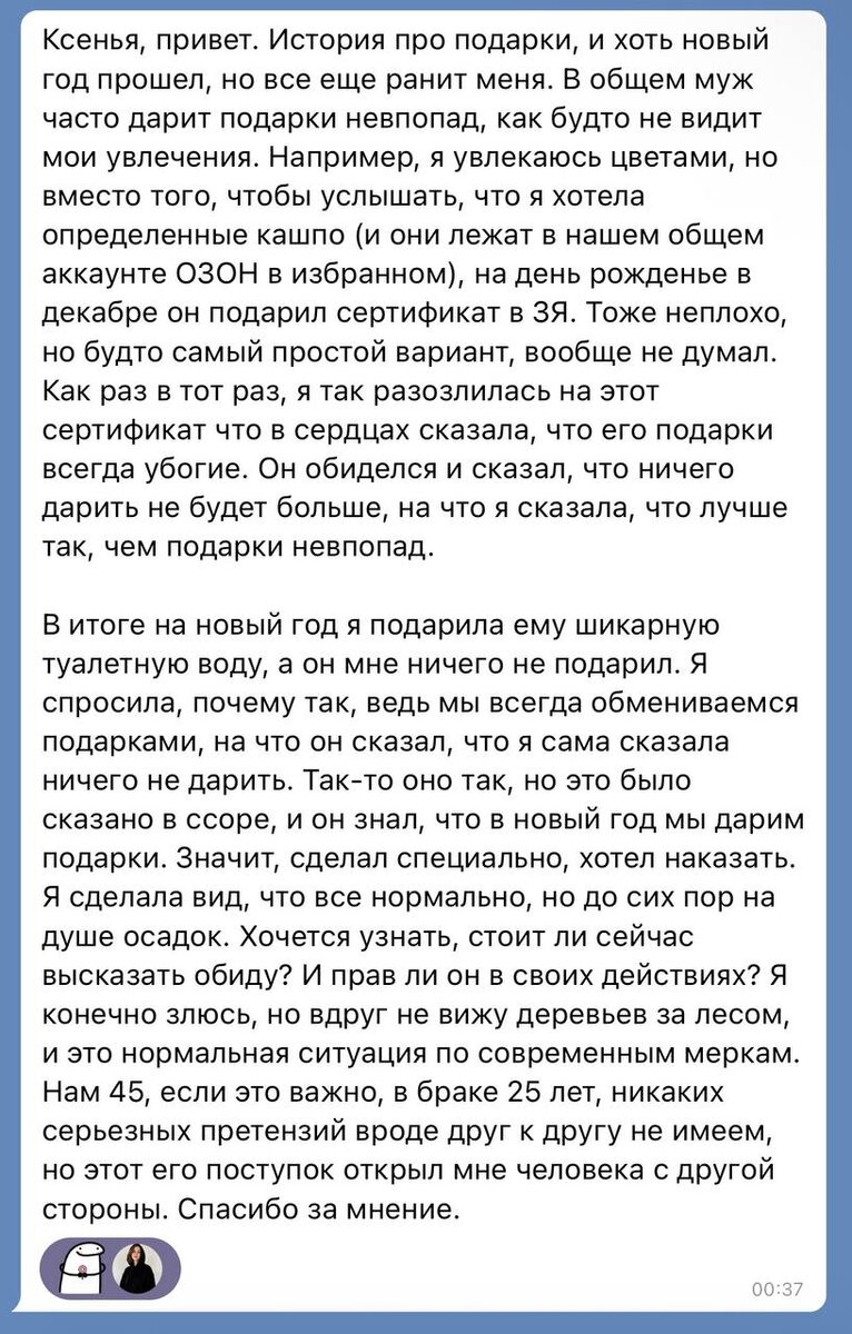 ) Еще не остыли салаты, как подъехала история про новогодние подарки. Точнее, про их отсутствие. Пора, коллеги, заряжать наши комментометы и выражать мнение. Суть Муж автора подарил ей на ДР из ЗЯ, хотя автор увлекается цветами и хотела кашпо. Автор сказала мужу, что его подарки всегда убогие, и муж ответил, что больше ничего не будет дарить. На новый год автор подарила мужу туалетную воду, а он ей ничего. Автору обидно. Вопросы 1. Прошло время с момента разговора о подарках: стоит ли сейчас говорить об обиде? 2. Прав ли муж? Истории сюда одним сообщением: @mentorksenia