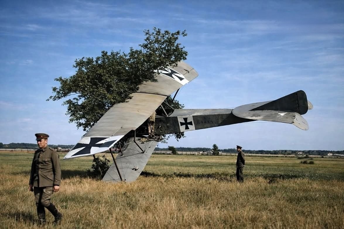 Немецкий разведывательный биплан LVG B.I врезается в дерево. Первая мировая война.