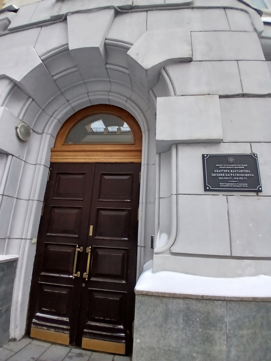 Но вернёмся к квартире. Эту квартиру Евгений Вахтангов получил в 1918 г., по просьбе МХТ и лично Владимира Немировича-Данченко, обратившегося к Луначарскому. До этого Вахтангов, со времени своего приезда в Москву из Владикавказа в 1903. жил на сьемных квартирах. Сначала Евгений Богратионович жил тут с женой и сыном, позже перевез из Владикавказа мать и сестру. В этой квартире он жил вплоть до своей смерти в 1922 г.