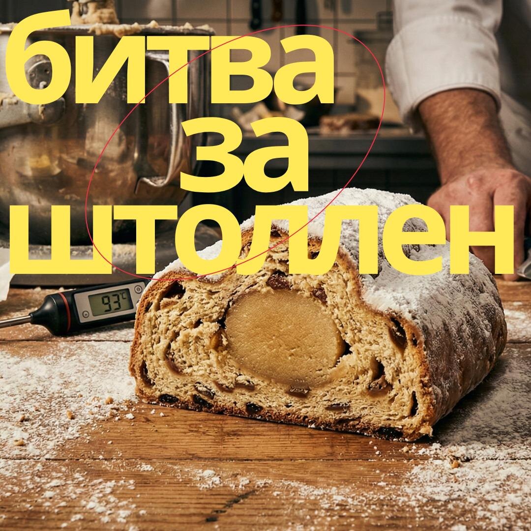 Разбор полетов и техкарта В сторис вы видели, как я вчера чуть не поседел на кухне. Замес 5 кг теста, перегрев до критических 38°C, реанимация в морозилке... Почему нельзя просто смешать муку с маслом? Потому что настоящий Дрезденский штоллен - это не кекс. Это тяжелая, плотная масляная структура, которая должна зреть 3 недели. Чтобы удержать 1,5 кг орехов и 450 г масла, обычные правила домашней выпечки здесь не работают. Я подошел к вопросу как технолог. 👇 МОИ 3 ГЛАВНЫХ ВЫВОДА ПОСЛЕ СМЕНЫ: 1️⃣ Мука - только Манитоба. Обычная мука (белок 10-11%) просто «поплывет» под весом масла и цукатов. Нам нужен мощный каркас. Манитоба (белок 13-14%+) работает как арматура. Она держит структуру даже при экстремальном количестве сдобы. 2️⃣ Марципан домашний. Магазинный марципан = сахар + миндальный ароматизатор. Это скучно. Моя формула: Миндальная мука + Розовая вода + Темный ром + Цедра + СОЛЬ. Соль взламывает рецепторы и делает вкус объемным. 3️⃣ Температурный режим. Это была моя ошибка. М
