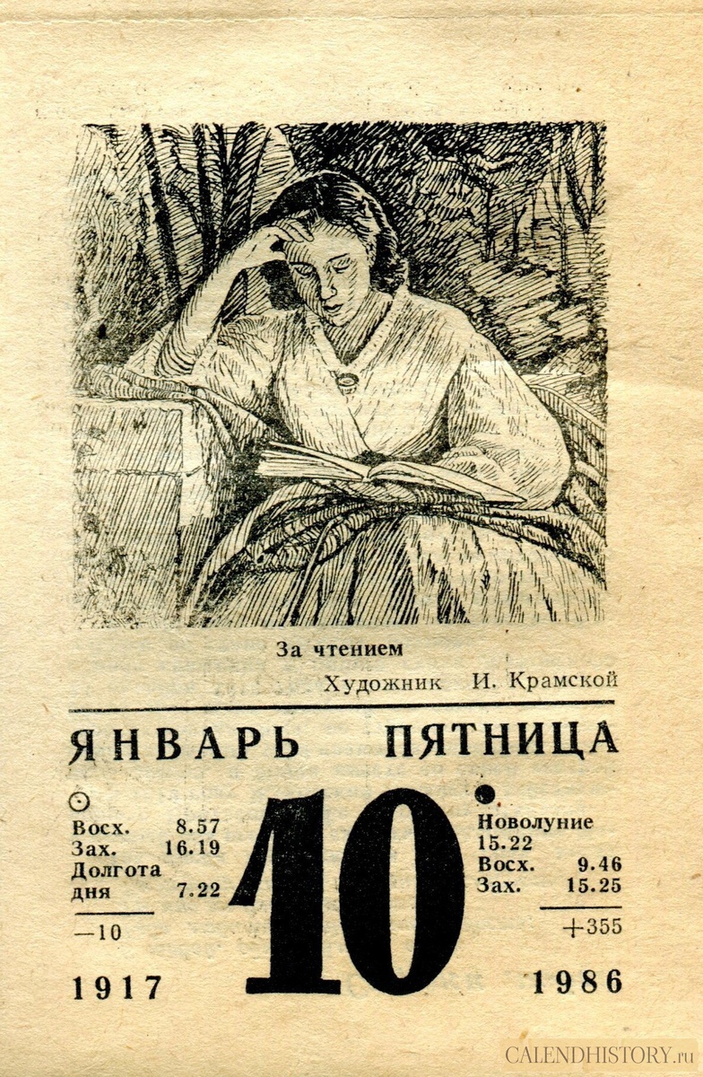 10 января 1986-го года — Календарь для женщин За чтением Художник И. Крамской Больше старых советских отрывных календарей смотрите у нас на сайте - calendhistory.ru https://calendhistory.ru/10-janvarja-1986-go-goda-kalendar-dlja-zhenshhin/