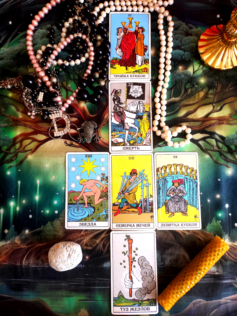 Неделя выстраивается в идеальную последовательность трансформации: отпускание отжившего (Смерть) создаёт пространство для лёгкости и радости общения (3 Кубков) и глубокой надежды (Звезда). Эта надежда, подкреплённая профессиональным удовлетворением (9 Кубков) и финансовой осмотрительностью (7 Мечей), находит своё воплощение в мощном новом начале (Туз Жезлов).