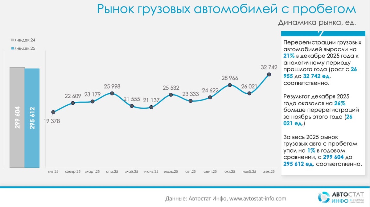 % По данным «Автостат Инфо» рынок грузовых автомобилей с пробегом в России завершил прошлый год почти на уровне 2024-го, но с заметным ускорением в декабре. За год было переоформлено 295 612 грузовиков, всего на 1% меньше, чем годом ранее (299 604 ед.), тогда как в декабре перерегистрации в этом сегменте выросли сразу на 21% год к году, с 26 955 до 32 742 ед., (+26% к ноябрю 2025-го). Таким образом, вторичный грузовой рынок практически отыграл провал первого полугодия: к концу года продажи б/у техники пошли в рост, что видно по траектории с весеннего проседания к пику октября и сильному декабрю. Это типичная реакция бизнеса на неопределенность: в первой половине года компании откладывали обновление парка, во второй половине они вернулись к покупкам, но в основном на «вторичке», где ниже ценовой порог входа и шире выбор по конфигурациям. Структура по маркам показывает, что ядро рынка по-прежнему удерживает КАМАЗ, но без былого отрыва. В декабре продажи подержанных грузовиков этой мар