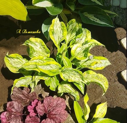 - вначале серебристый, затем золотистый перламутр в окраске - вторая немаловажная для меня (и думаю для многих любителей хост) изюминка это присборенные листья - третья это необычные пятна в центре листьев бело-зелёного цвета Сорт необыкновенно красивый , неповторимый , но и растёт странно. Фотографированию поддаётся сложно, блеск немного видно в видео, кому интересно посмотрят, на фото совсем не то "пальто" , как говорится . Данное фото для понимания с листьями-компаньонами ,об этом и пойдёт речь о ЧЕТВЁРТОЙ изюминке и данной публикации По описанию сорта его размер 35см.