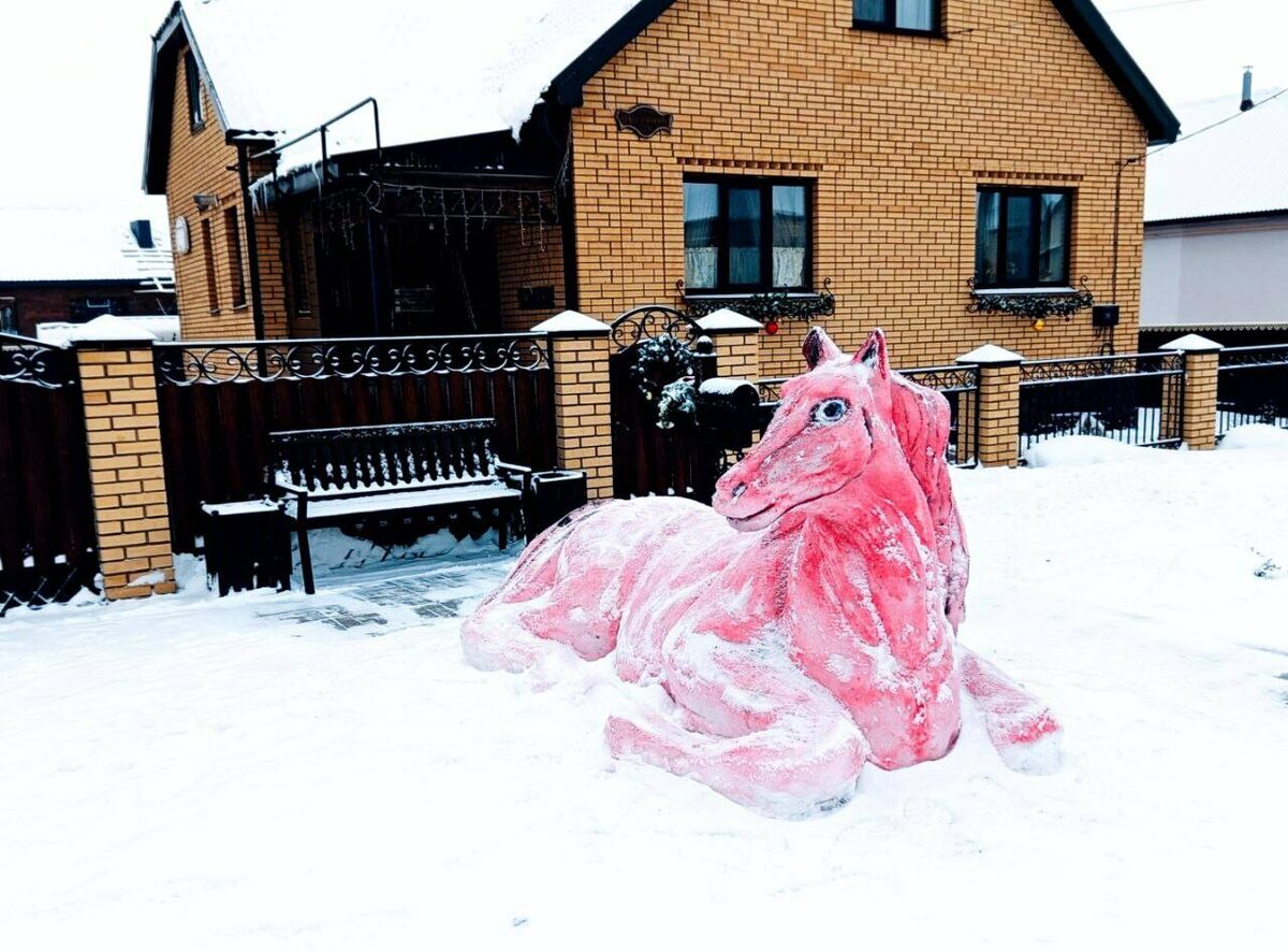 Автор: Эльза Кузнецова Семья Тихоновых из Нурлата – Алексей, Нонна и их сыновья Кирилл и Никита – создали снежную скульптуру Огненной Лошади, символа 2026 года. Традиция создавать масштабные снежные фигуры накануне Нового года уже несколько лет объединяет эту творческую семью. В прошлом году их гигантская снежная змея радовала горожан, а в этом Тихоновы взялись за еще более амбициозный проект. Работа над скульптурой стала настоящим семейным делом: от идеи и эскиза до лепки и финального декора. По словам Тихоновых, процесс подарил не только результат, но и часы живого общения и совместного творчества. «Для нас это больше, чем просто увлечение, – делится Нонна Владимировна. – Совместная работа еще больше сплачивает семью, учит детей терпению и умению доводить начатое до конца. А главное – очень приятно видеть, как наша Огненная Лошадь дарит прохожим улыбки и праздничное настроение. Многие останавливаются, фотографируются, некоторые специально приводят детей посмотреть». Снежная фигура ст