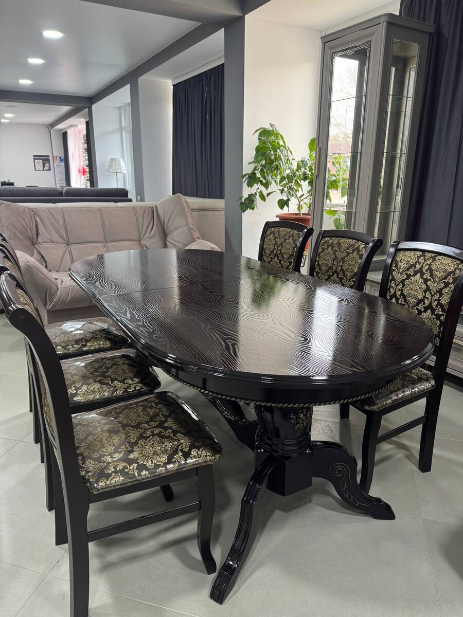 На фото представлен круглый обеденный стол с темной поверхностью, выполненный в классическом стиле
