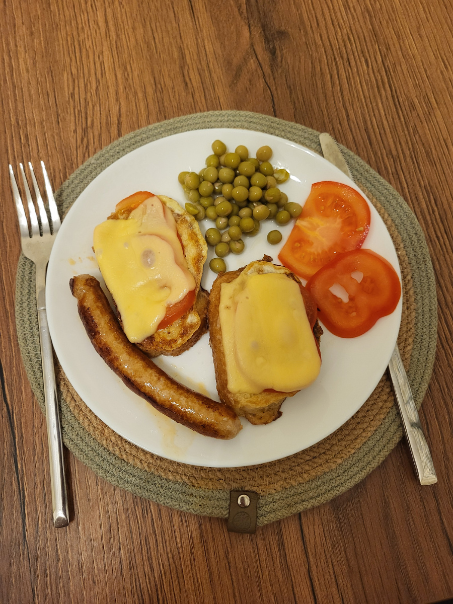 На завтрак у меня сегодня гренки с сыром и помидорами и колбаска с горошком