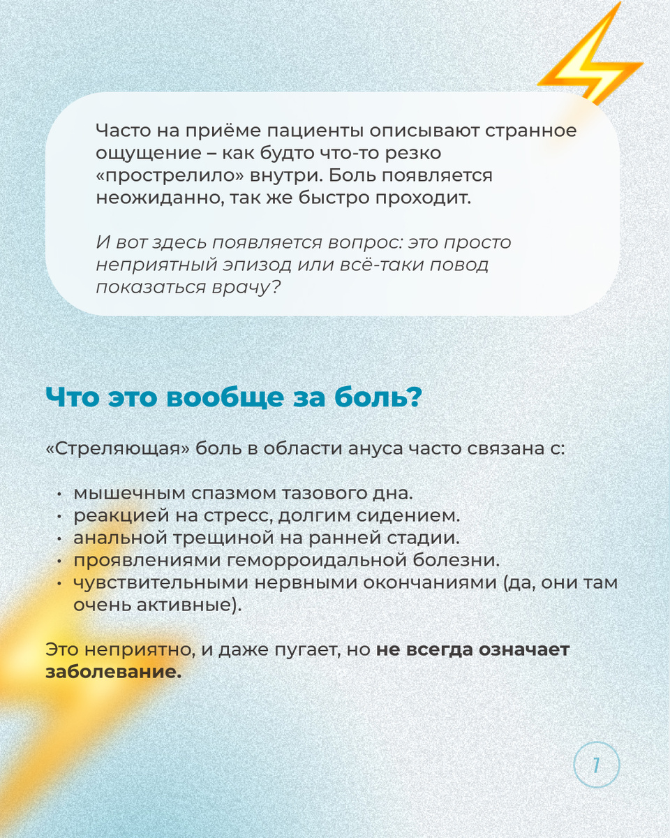 «Иногда будто током простреливает… Что происходит?» ⚡️ Внезапная резкая боль в области ануса может появиться ниоткуда и так же быстро исчезнуть. Многие пациенты на приеме проктолога описывают это как короткий «удар током» – сначала пугает, а потом кажется, что ничего и не было. 👨⚕️Мы разобрали с нашим колопроктологом, Маркаряном Эдуардом Жориковичем, что за ощущения могут возникать, о чём они говорят, когда стоит показаться проктологу и когда можно просто наблюдать за собой. Листайте карусель! 💡 Хотите записаться к проктологу? Переходите на наш сайт! ___ Клиника «ФлебоЭксперт» fleboexpert.ru 8 800 100 87 48 г. Пятигорск, пр-т Калинина, д. 98 г. Майкоп, ул. 8 Марта, д. 20 (ул. Пролетарская, д. 351) г. Туапсе, ул. Карла Маркса, д. 5
