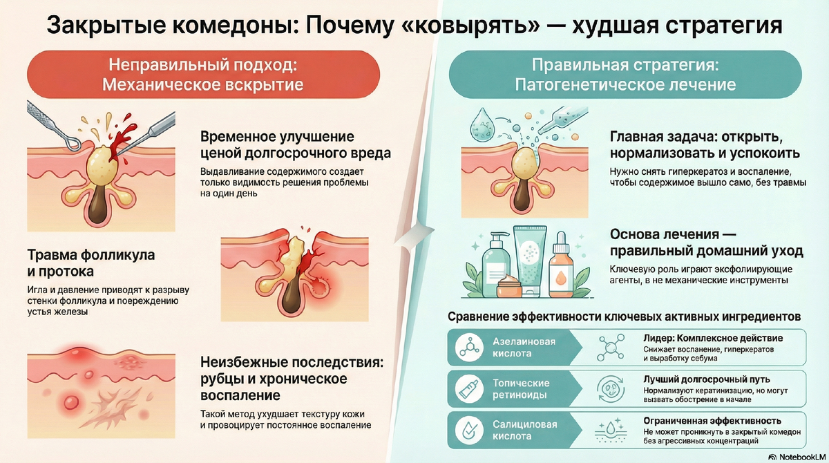 Закрытый комедон — не механическая задача на «выдавить», а патогенетическая задача на открыть, нормализовать и разгрузить фолликул.