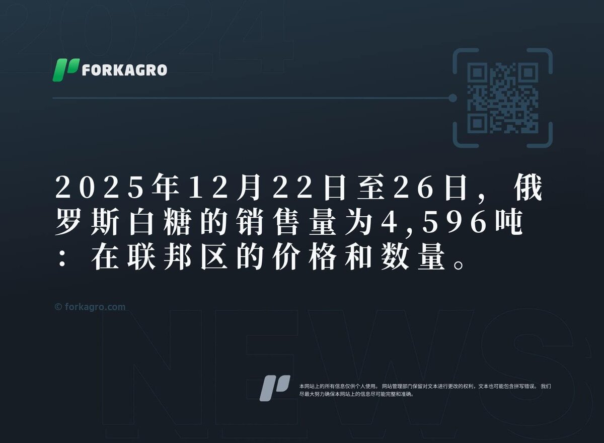 В интервале с 22.12.2025 по 26.12.2025 года на Национальной товарной бирже и Санкт-Петербургской товарной и сырьевой бирже было продано общее количество величиной 4 596 тонн белого сахара по средней стоимости 56 284 рублей за тонну (эквивалентно 717,57 долларов за тонну по курсу Центрального банка России на дату публикации: 78,4368 рубля за доллар), включая следующие федеральные округа: Объемы торгов и цены по федеральным округам за период с 22.12.2025 по 26.12.2025 года © sugar.ru