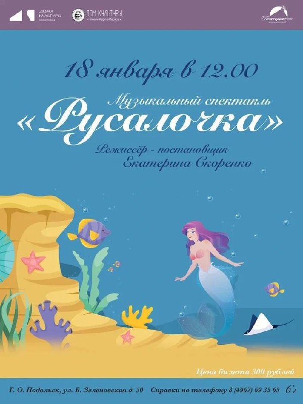 ✨ Спектакль «Русалочка» 🪸 Дорогие друзья! Приглашаем вас на музыкальный спектакль «Русалочка» в исполнении театрального коллектива «Постскриптум» 💥Яркий спектакль, наполненный песнями, танцами и увлекательной сюжетной линией! 🌟 Режиссер-постановщик Екатерина Скоренко ⏳Продолжительность 1 час 🚫 Возраст: 6+ 📆 18.01.2026 🕒 12:00 🏢 ДК им. Карла Маркса 📍 г. Подольск, ул. Большая Зелёновская, 50 💰 Цена: 300 ₽ 🎫 Купить билет: https://clck.ru/3QyKg8 ⭐Поддержать канал голосом 🍰Где поесть в Подольске ✅ Мероприятия Подольск https://dzen.ru/id/66ed500f7b5671493eca3fd6 http://vk.com/podolsk_events http://dzen.ru/podolsk_events