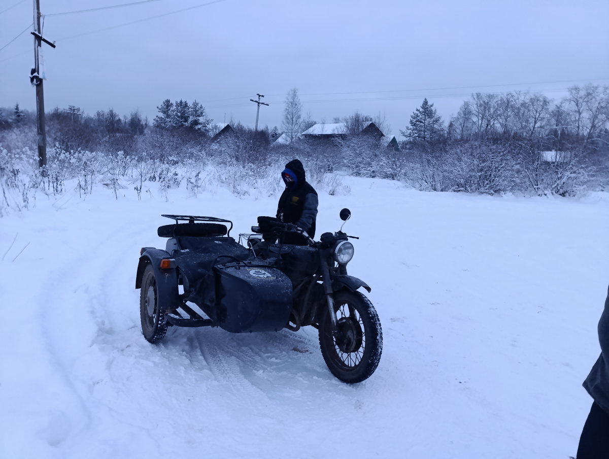 Ну как не поделиться первым выездом 26 года? Повод незначительный, но душевный: посетила своих друзей на даче, по программе все выключено". Пока ехала на электричке, и наблюдала как за окном проносятся замерзшие деревья, читала сообщения от Антона с Ксюшей "а ты реально к нам едешь что ли?" Смех, смехом, а меня приехали забирать на мотоцикле "Днепр", который не смотря на холодную зиму и простой в гараже, смог завестись. Не скажу, что получилось сразу, был риск, что придется наслаждаться зимнем лесом на своих двоих. С улыбкой на лице выхожу из вагона и уже на перроне вижу замерзших ребят. Краем уха слышу чей-то возглас - вот это раритет! Да, это наш почетный старичок с богатой историей. Когда-то он своим ходом приехал с одной из прибалтийских республик. Ребята уже подмерзли, ведь они уже и в магазин скатались и за мной приехали. Пока они утепляются, забираюсь в коляску. Аккуратно слежу за вещами, был уже прецедент, вылезая с этого модного места, я как-то порвала штаны на пятой точке.