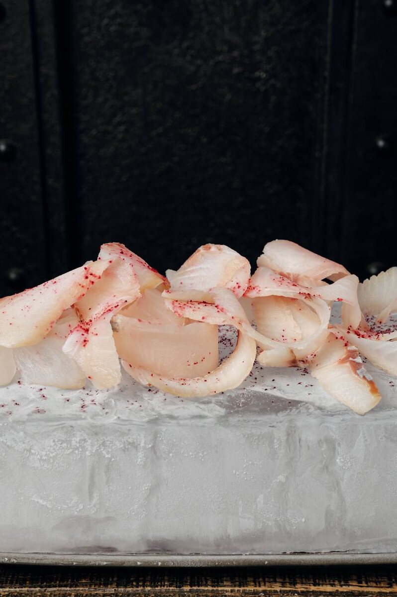 В «Матрёшке» муксун замораживаем до экстремально низких температур и срезаем тонкими, почти прозрачными стружками.