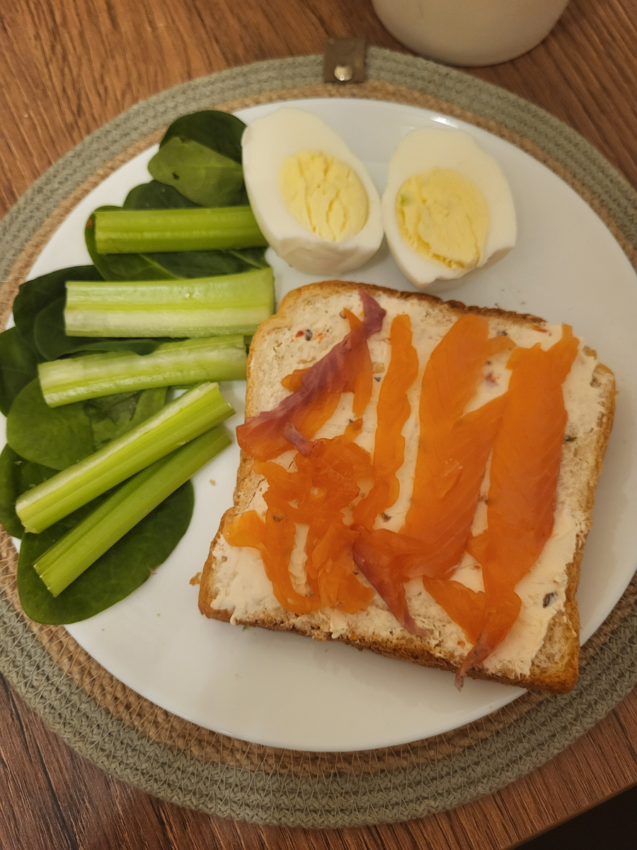 Сегодня у меня на завтрак шпинат, сельдерей, бутерброд с красной рыбкой и вареное яйцо.