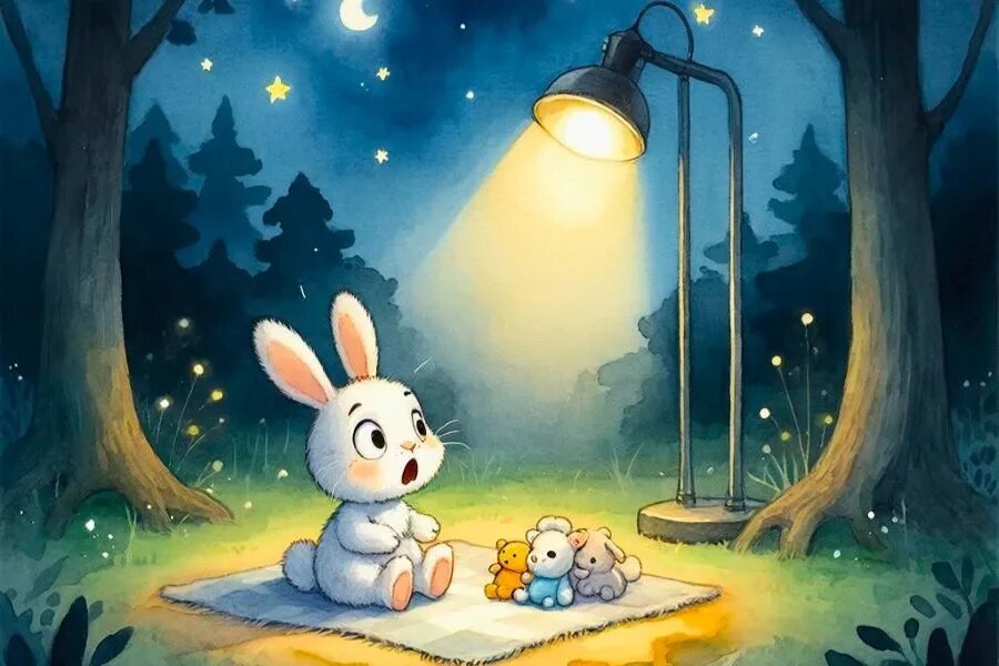 «Но темнота не страшная,» – сказал светлячок. «Она просто другая. Посмотри!» Светлячок зажег свой фонарик, и вокруг стало немного светлее. Ушастик увидел, что в темноте тоже есть красота: мерцающие звезды, тихий шелест листьев, мягкое свечение луны. «Видишь?» – сказал светлячок. «Темнота – это время для отдыха и волшебства. А я буду светить тебе, пока ты не уснешь.» Ушастик улыбнулся. Он понял, что темнота не такая уж и страшная. Он забрался в свою норку, а светлячок тихонько светил ему, пока зайчонок не уснул, видя д