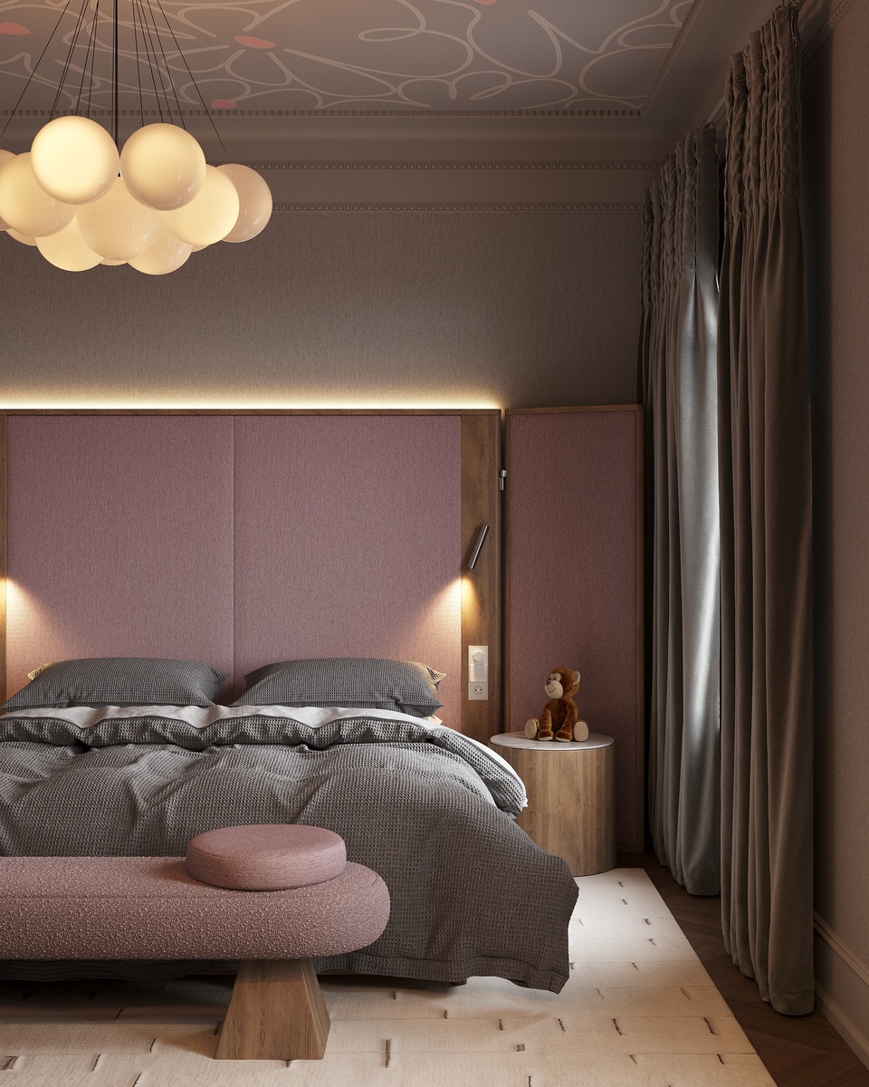 Элегантный романтичный интерьер с особым шармом – такое настроение создает сочетание розового и серого, которые в тандеме смотрятся гармонично и эффектно. Эти оттенки разбавляет белый и светлое дерево. Розовый на таком фоне раскрывается особенно благородно, создавая уют и легкое расслабленное настроение, а серый создает подходящую основу, чтобы дать проявиться акцентным деталям в пространстве: мягкому изголовью-ширме с подсветкой, светильнику, по форме напоминающему легкое облачко, округлой скамье с нестандартными ножками и подушками. Нейтральный деревянный стол дополняют необычный светильник и стул, поддерживая игру форм и оттенков в интерьере спальни.