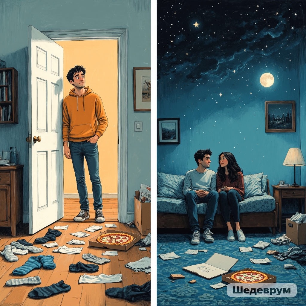 ⚪️ На деле было прозаичнее: носки, хлопанье дверью, угрюмое молчание и примирительная пицца. ❓Но куда делся скучный сценарий? Его съела и переварила история, «довольно небрежно сплетённая» для гостей.