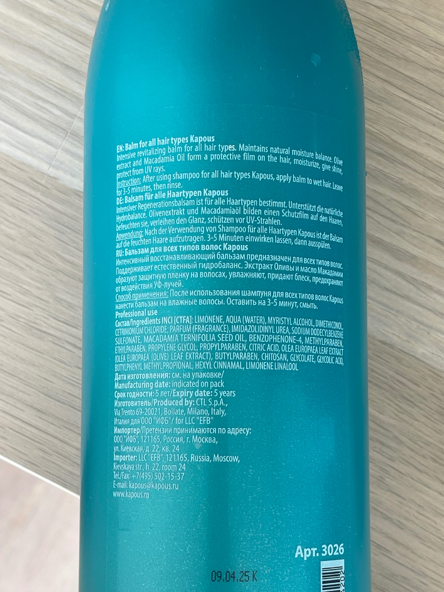 Этот бальзам-кондиционер для волос мне посоветовала профессиональный стилист по волосам, мастер международного класса, утверждая, что это рабочая лошадка, которую часто используют даже на чемпионатах по парикмахерскому искусству. Бренд известный- Kapous, делают в Италии, бальзам для всех типов волос, не путаем с гиалуронкой и для окрашенных, в таких же зеленых банках.