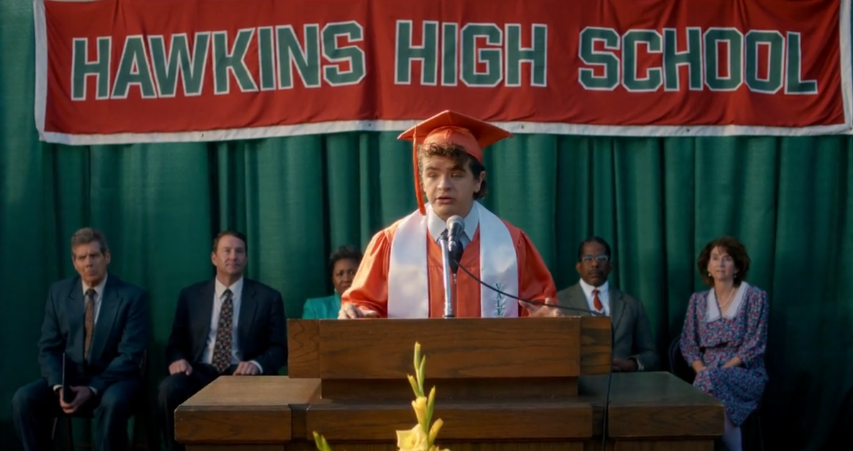 - Выпускные мантии: Необычный цвет мантий героев, выбивающийся из реалий школы Хоукинса, был воспринят как признак искаженной, иллюзорной реальности.