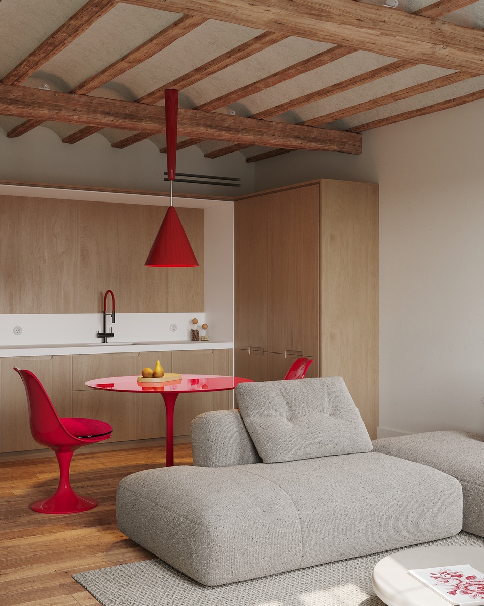 Красный всегда привлекает внимание, даже, если его использовать дозированно. Согласно психологии цвета, в пространстве он повышает активность, концентрацию внимания и улучшает настроение. В этом интерьере в качестве ярких штрихов выступают пара полок на стеллаже, эффектная столовая группа, кран на рабочей поверхности кухни и, конечно же, живые цветы на журнальном столике. Красный цвет хорошо смотрится в паре с белым и удачно разбавляет нейтральные пастельные тона. Но привлекающий внимание цвет – не единственный акцент в моем проекте кухни-гостиной. Деревянный пол и фасады кухни уравновешивают балки на потолке такого же оттенка. Стилистику дополняют деревянные ставни на окнах и натуральный текстиль – классические атрибуты загородного дома, в данном пространстве эффектно смешанные с современными предметами мебели. В этом сочетании светлые тона уравновешивают активный красный и насыщенные деревянные фактуры, создавая цветовой баланс в пространстве.
