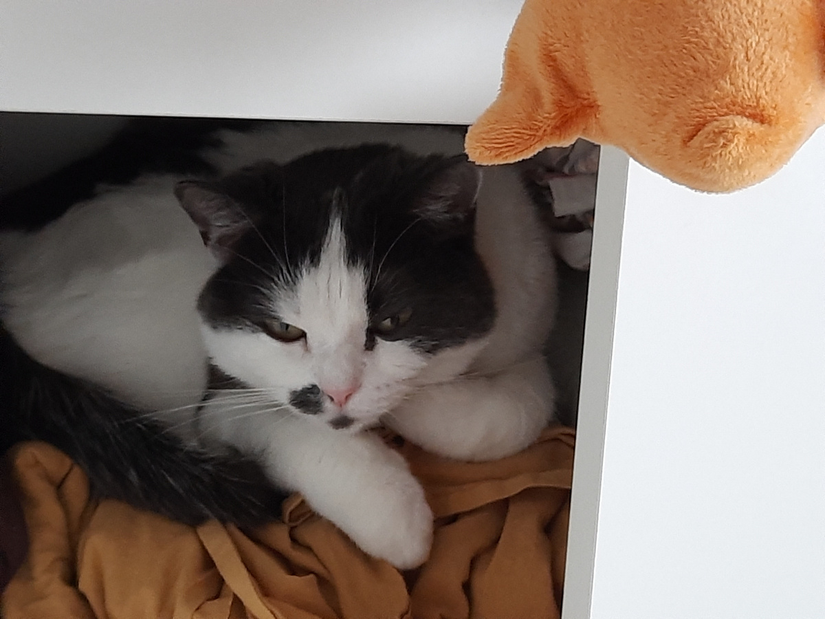 Ушла девочка в шкаф на чистое бельё 🤦 Да уже всё равно. Я перестала закрывать шкаф, потому что она сидит, царапает дверь, просит пустить. Пока я до конца на ноги не встану, пусть живёт, где хочет.